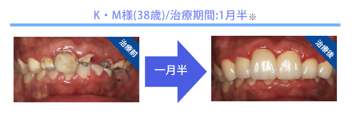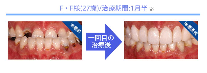 初回に2時間の集中治療を行います。治療が必要な歯を全部同時に治療し、歯を調整して、最後に白くて見た目がキレイな仮歯(プラスチック製)を装着し、きれいな口元になります。